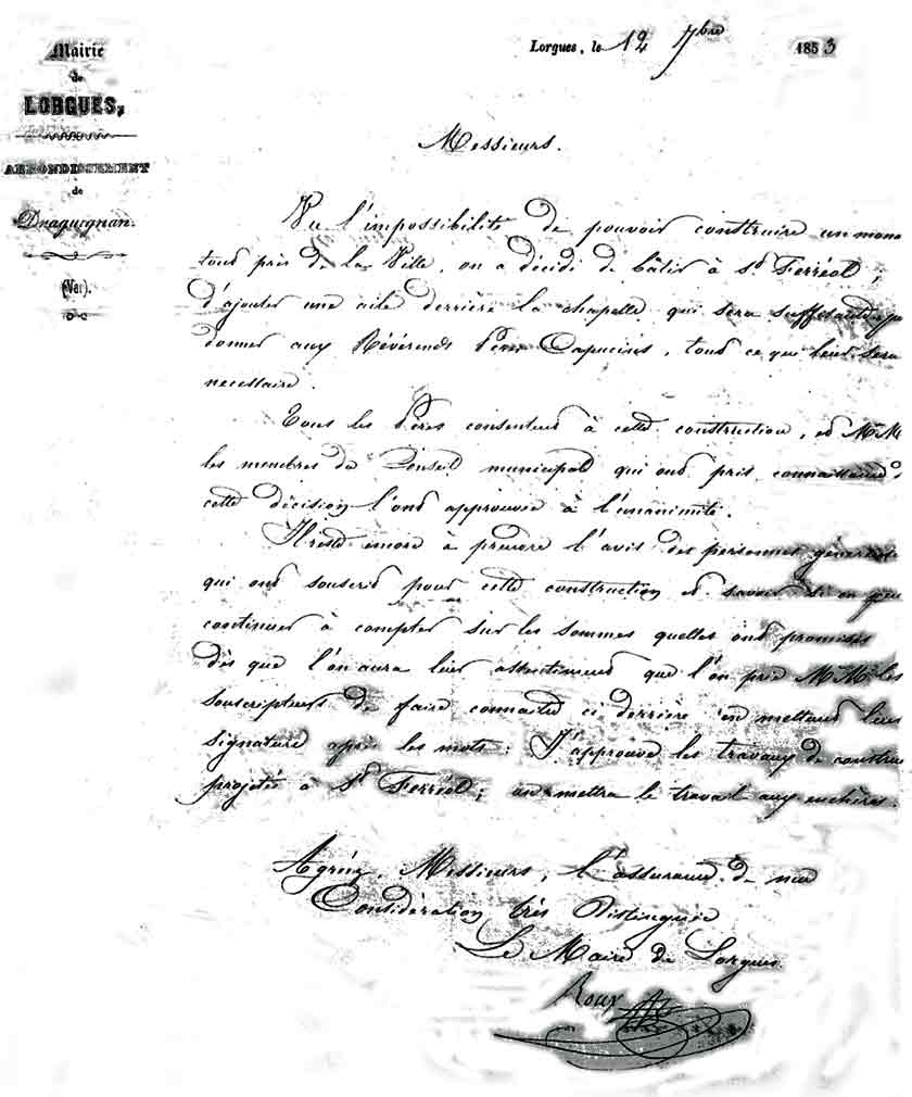 | Le maire Roux demande aux personnes qui ont fait des promesses de dons pour la construction du couvent des Capucins de confirmer leur accord concernant la décision du conseil municipal d'agrandir St-Ferréol au lieu de construire près du village. |