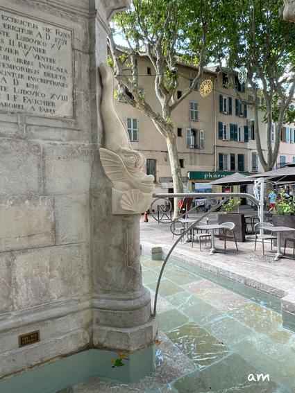 Réfection 2025 De nouveaux dauphins ont été sculptés, respectant mieux ceux d'origine, on peut toutefois à nouveau regretter la couleur de la pierre. Par contre on appréciera le retour du revêtement du bassin en dales de marbre. |